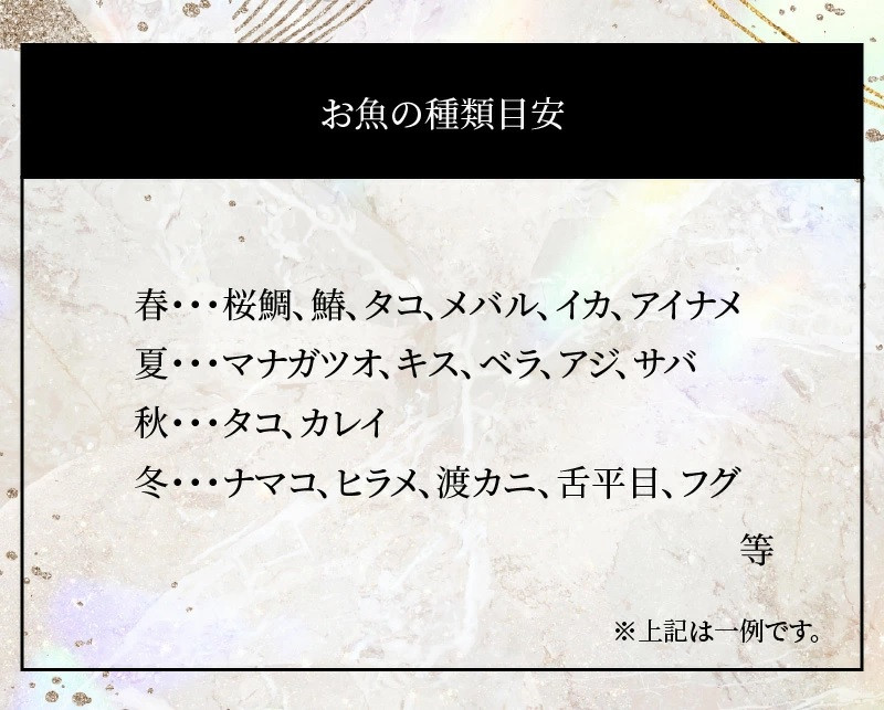| 容量 | 5~6尾(約2.5kg)×1箱 【季節のお魚の一例】 春:桜鯛、鰆、タコ、メバル、イカ、アイナメ 夏:マナガツオ、キス、ベラ、アジ、サバ 秋:タコ、カレイ 冬:ナマコ、ヒラメ、渡カニ、舌平目、フグ など |