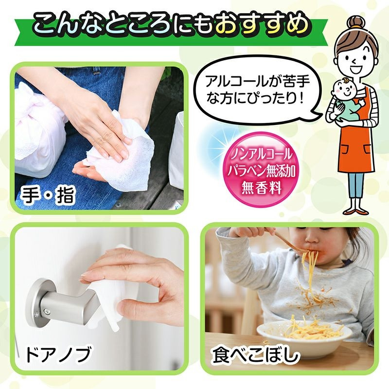 アルコールを使用していない除菌シートです。アルコールが苦手だけど除菌はしたい方へおすすめです。