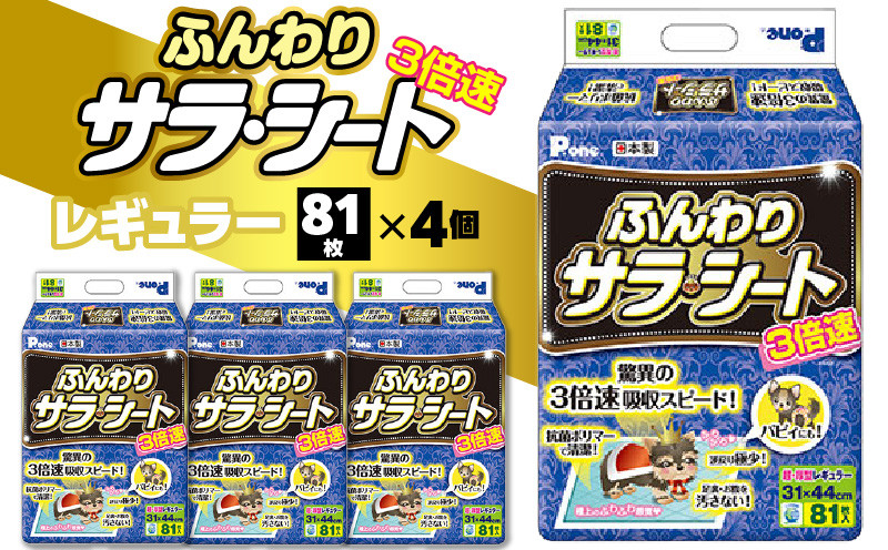 ふわふわ表面材で吸収力が驚異の3倍速スピード 【ふるさと納税】3倍速 ふんわり サラ・シート レギュラー 81枚×4個(324枚) ペット用 ペット 犬用 犬 トイレ トイレ用品 トイレシート シーツ トイレシーツ ペットシーツ ペットグッズ グッズ おしっこ 日本製 ペットシート 消耗品 日用品 香川県 三豊市 送料無料