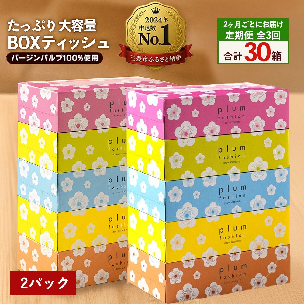 ふるさと納税 ティッシュ Boxティッシュ プラムファッション 坪野谷紙業 【ふるさと納税】 ティッシュ ティッシュペーパー 「 大容量 プラムファッション BOXティッシュ 定期便 2パック (ケース10個入り) 全3回(2ヶ月ごと) 」 [ 常備品 生活用品 まとめ買い 蛍光染料不使用 日用品 日用雑貨 日用消耗品 ]