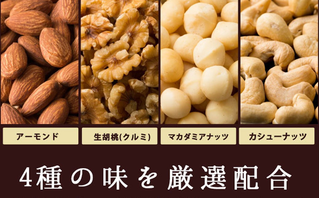 当ミックスナッツは、アーモンド、クルミ、カシューナッツ、マカダミアナッツといった人気のナッツを、