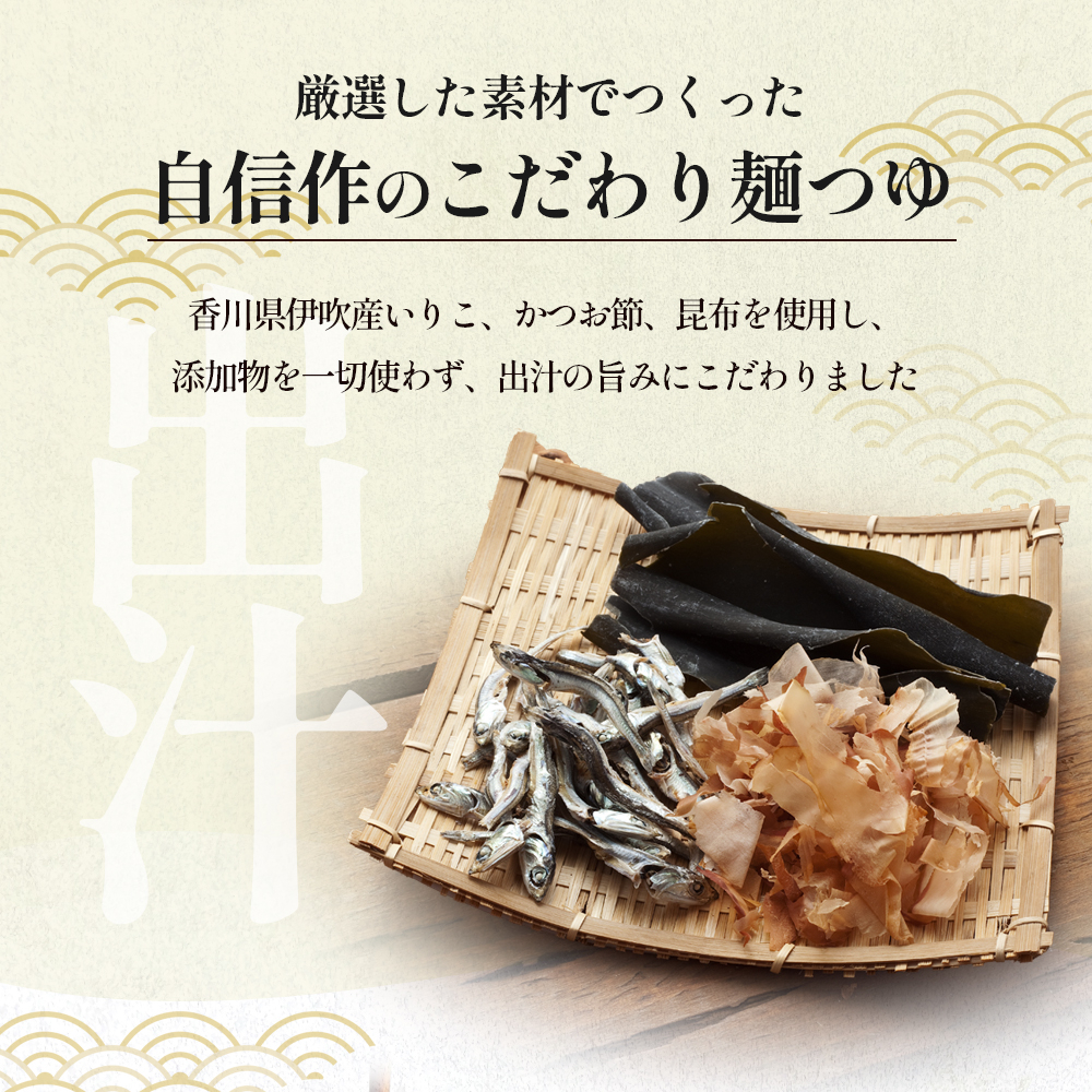 香川県伊吹産いりこ、かつお節、昆布を使用し、小豆島の製麺所庄八が自分の作った麺に合うようにと、自ら改良に改良を重ねて作った自信作のこだわり麺つゆ。