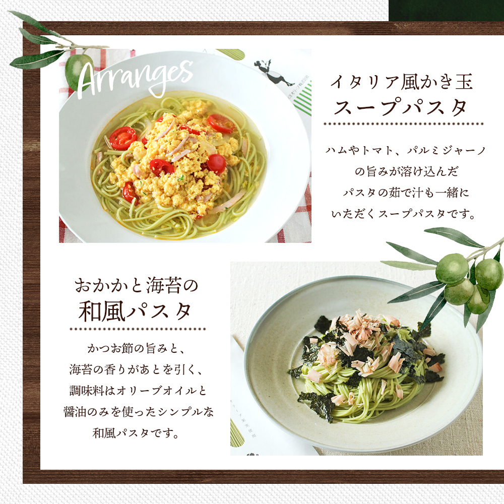 手延べオリーブパスタは、オリーブ果実を練りこんだ緑のパスタ。