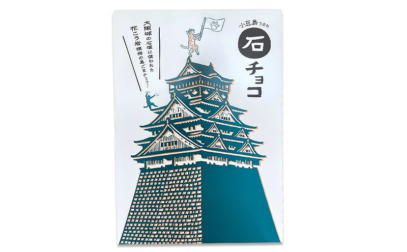 中には大坂城の石垣にも使われた小豆島の「花崗岩」のようなごま味アーモンドチョコレートが入っています。小豆島石の歴史物語を伝えるかわいらしいパッケージとともに、アーモンドのカリッとした食感、黒ごまの風味をお楽しみください。