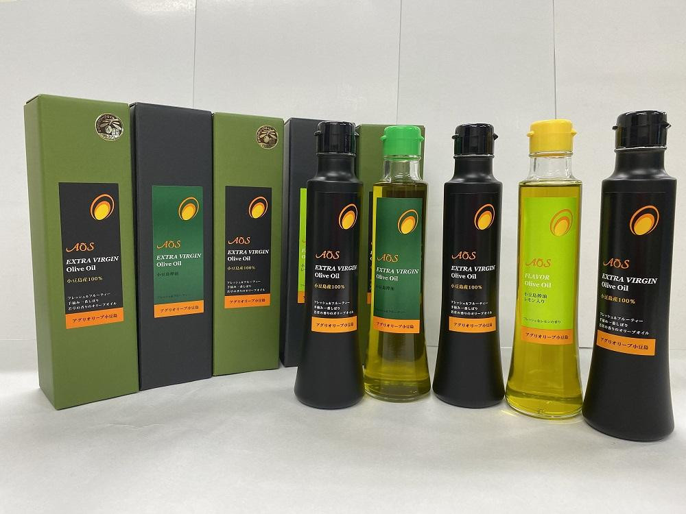 若草の香りがさわやかな小豆島産100%エキストラバージンオリーブオイル182g×3本、スペイン産オリーブを自社工場で採油したエキストラバージンオリーブオイル182g×1本、香川県産レモンの爽やかな味わいのフレーバーオイル182g×1本のセットです。