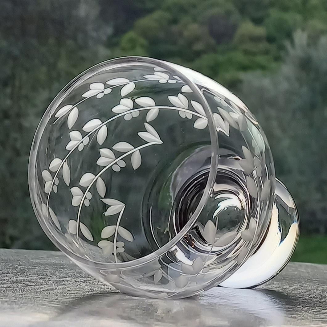 台座のしっかりしたワイングラス(透明)です。デザインは「オリーブの恵み」。透明な器なので、お酒の色をそのまま楽しむことができ、オリーブのカットの文様がとてもフィットします。