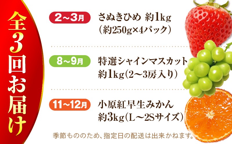 それぞれの旬の時期にあわせて、フレッシュな果物をお届けいたします! さぬき旬のフルーツ満足 3回定期便 | フルーツ定期便 果物 フルーツ 青果 青果物 いちご みかん シャインマスカット さぬきひめ 果物定期便 定期便 3回 香川 小原紅早生みかん マスカット 旬の果物 季節の果物 贈答 贈り物 ギフト 化粧箱 取り寄せ 香川県 三木町 送料無料 |_mk006-t013