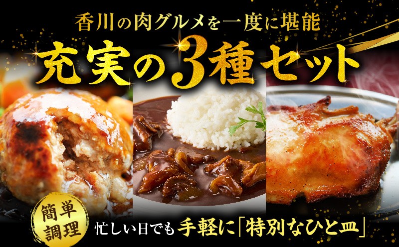 香川の肉グルメを一度に堪能できるセットをお届けします! 香川グルメ ご当地お肉3種セット ❘牛肉 オリーブ牛 牛すじ 湯煎 国産 冷凍 簡単調理 煮込み ハンバーグ オリーブ豚 肉汁 ジューシー 濃厚 骨付鳥 ひな 鶏 鶏肉 名物 スパイス やみつき 食品 お取り寄せ 家庭用 贈答 ❘_mk146-272