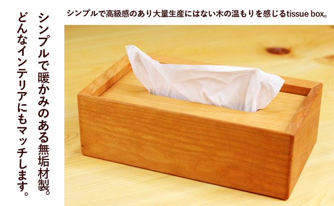 | 容量 | ティッシュボックス 1個 【サイズ】 外寸 長さ約26cm×幅約14.5cm×高さ約8.5cm 内寸 長さ約23.6cm×幅約12.1cm×高さ約6.8cm 【材質】チェリー材、底板 普通合板 【塗装】オイルフィニッシュ(亜麻仁油)、ラッペンワックス(無溶剤の蜜蝋) |