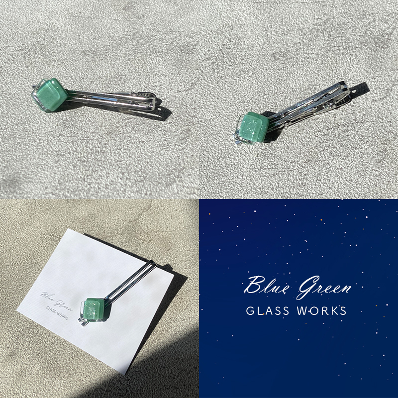 四角に切りだしたラメ入りの緑色ガラスに、クリアガラスを乗せて光の反射を楽しんでいただけます。