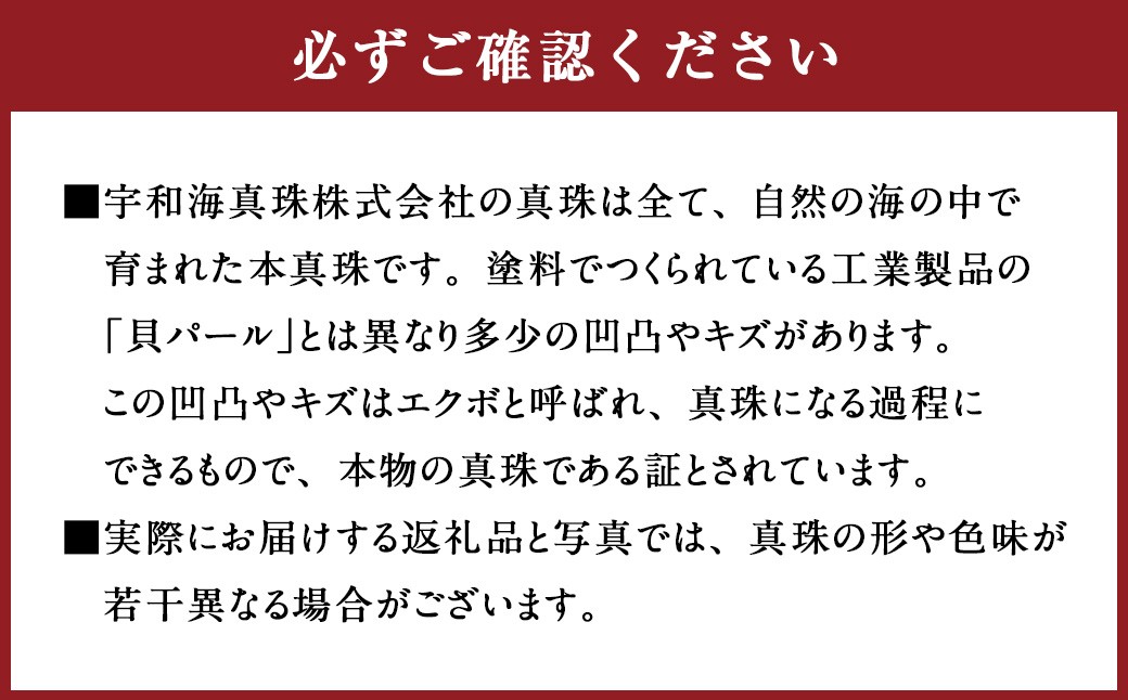 ・宇和海真珠株式会社の真珠は全て、自然の海の中で育まれた本真珠です。塗料でつくられている工業製品の「貝パール」とは異なり多少の凹凸やキズがあります。