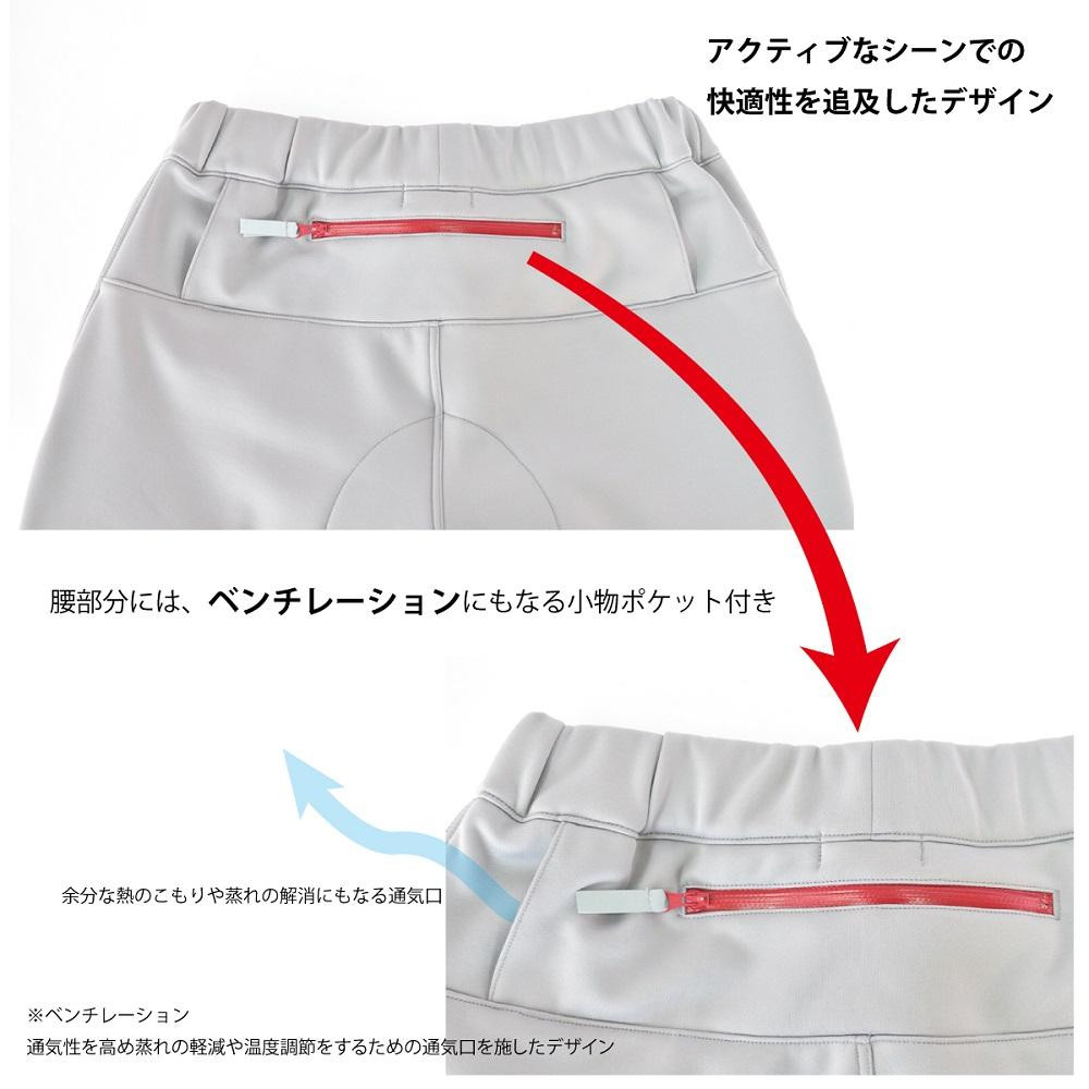 ヒップ部分の補強・再帰反射テープや膝の曲げやすい3D設計。