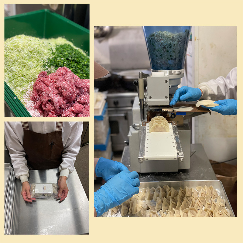 ひめ餃子・・・ご当地のお好み焼き(三津浜焼き)で使う牛脂を甘辛く味付けをした牛脂を餃子の餡に練りこんだ餃子です。パンチのある餃子に仕上げました。
