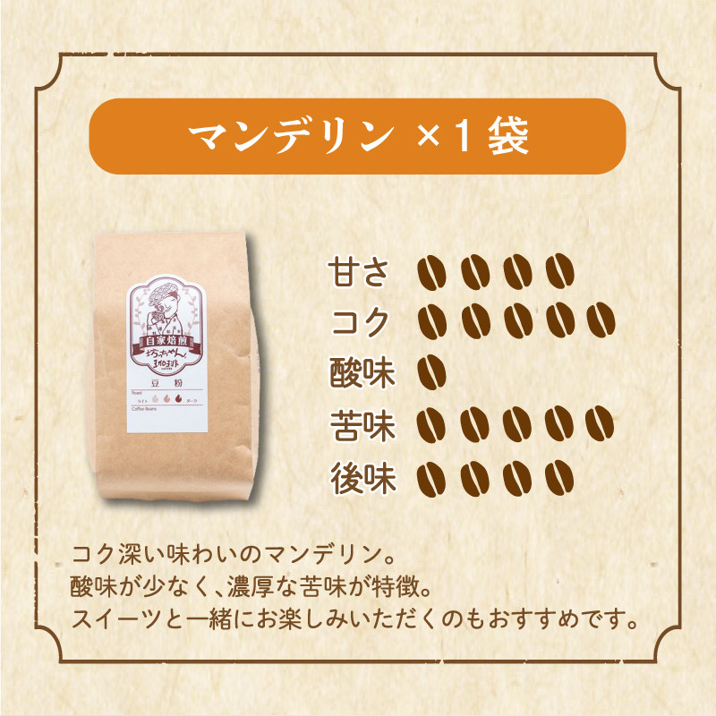 坊っちゃん珈琲自家焙煎(モカブレンド170g×2個、マンデリン170g×1個、ブラジル170g×1)粉の詰合せです。