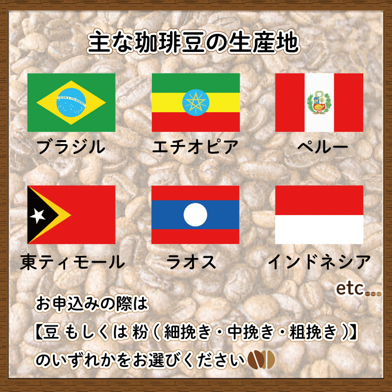 主な⽣産地として、ブラジル・エチオピア・ペルー・東ティモール・ラオスなどをご⽤意してお