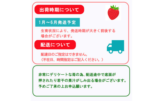 ※梱包には万全を期しておりますが非常にデリケートな苺の為、配送途中で底面が押されたり若干の果汁がしみ出る場合がございます。予めご了承の上お申込願います。