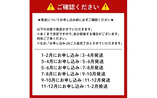 以下の日程で発送させていただきます。 ※あくまで目安ですので、多少前後する場合がございます。何卒ご了承ください。 ※なお、「お申し込み」はご入金完了日とさせていただきます。 1-2月にお申し込み:3-4月発送 3-4月にお申し込み:5-6月発送 5-6月にお申し込み:7-8月発送 7-8月にお申し込み:9-10月発送 9-10月にお申し込み:11-12月発送 11-12月にお申し込み:1-2月発送 |