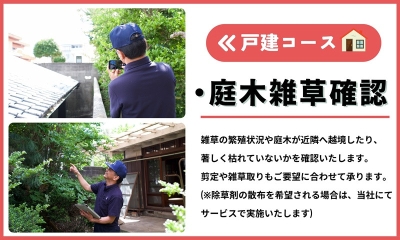 雑草の状態や、庭木が隣室へ越境したり、著しく枯れていないかなどを確認いたします。剪定や雑草取りもご要望に合わせて承ります。