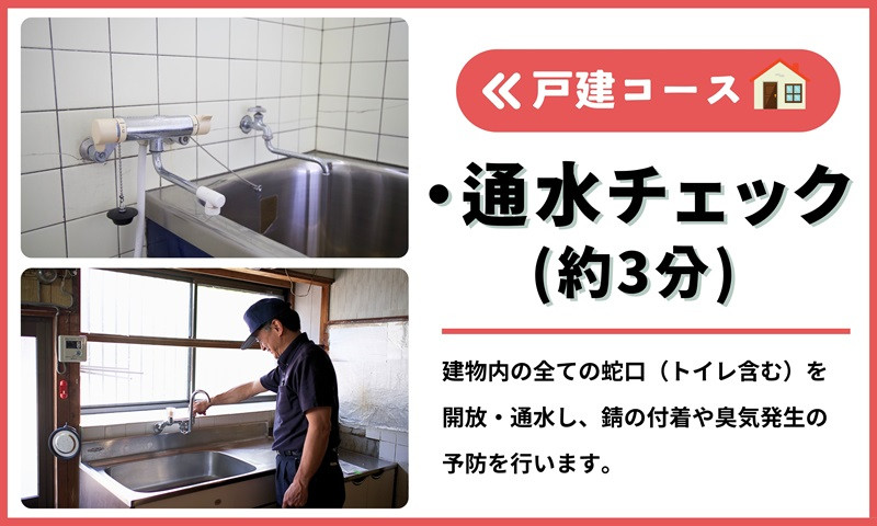 錆付着や臭気発生の予防のため、建物内の全ての蛇口(トイレ含む)を開放・通水します。