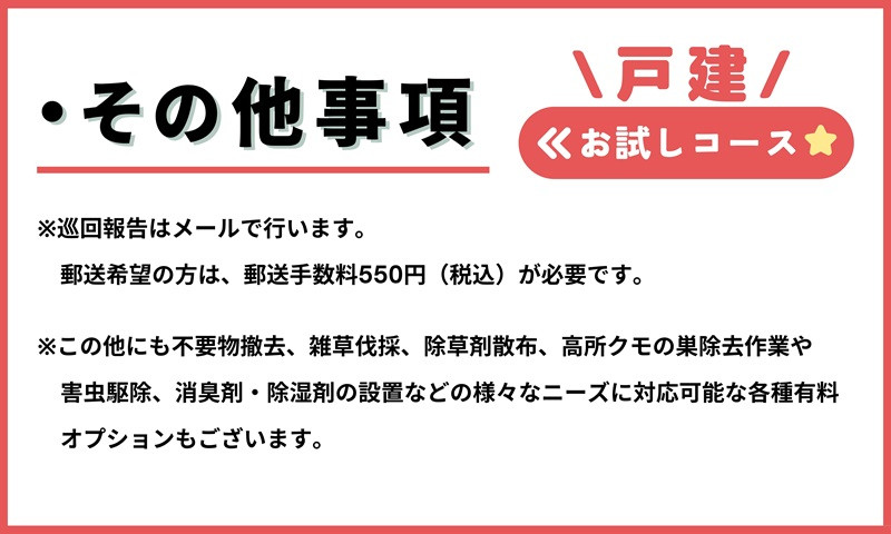 ※巡回報告はメールで行います。郵送希望の方は、郵送手数料550円(税込)にて対応させていただきます。