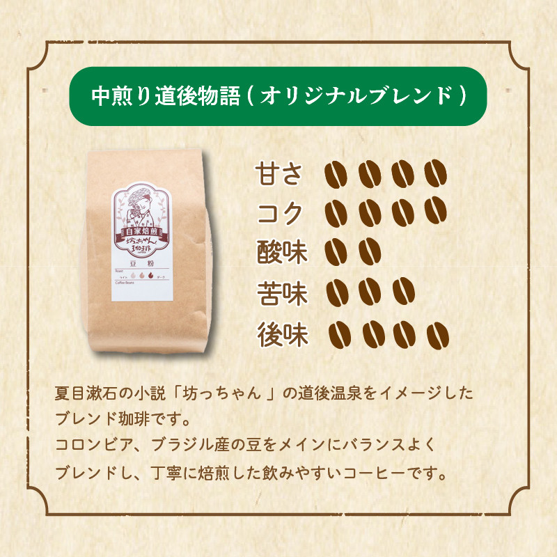 『坊っちゃん珈琲』でおなじみ、カフェー工房松山からお届け 【ご自宅用】自家焙煎コーヒー200g(豆or粉) 中煎り 坊っちゃん珈琲 | 珈琲 コーヒー おすすめ 道後温泉 道後 坊っちゃん 自家焙煎 ブレンドコーヒー コーヒー オリジナルブレンド 愛媛県 松山市