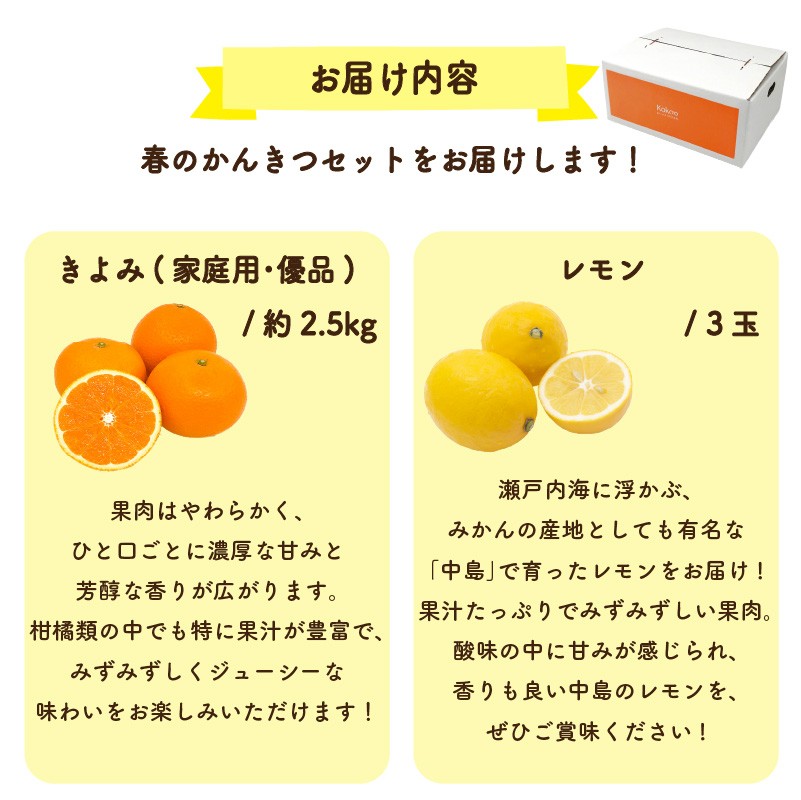 愛媛県松山市から旬のかんきつセットをお届け! 【先行予約】 きよみ 家庭用(優品) 約2.5kg & 瀬戸内海の島レモン3玉 | みかん オレンジ ミカン mikan 柑橘 かんきつ レモン 檸檬 れもん フルーツ 【2026年3月中旬頃から発送予定】みかん 愛媛みかん えひめみかん 愛媛ミカン mikan みかん 新鮮 柑橘 ふるーつ 果物 くだもの 農家直送 産地直送 期間限定 愛媛県 松山市 ココオ Koko'o