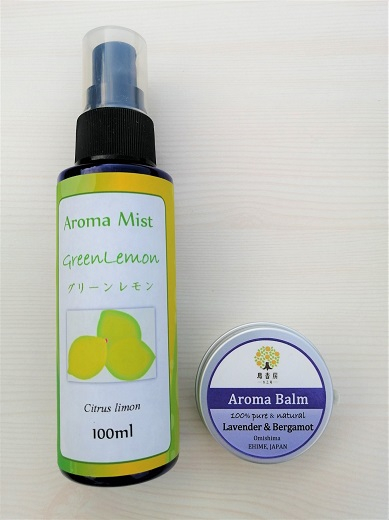 香りの島バーム(大三島産柑橘精油配合の保湿バーム)1個とアロマミスト グリーンレモン1本のセット。