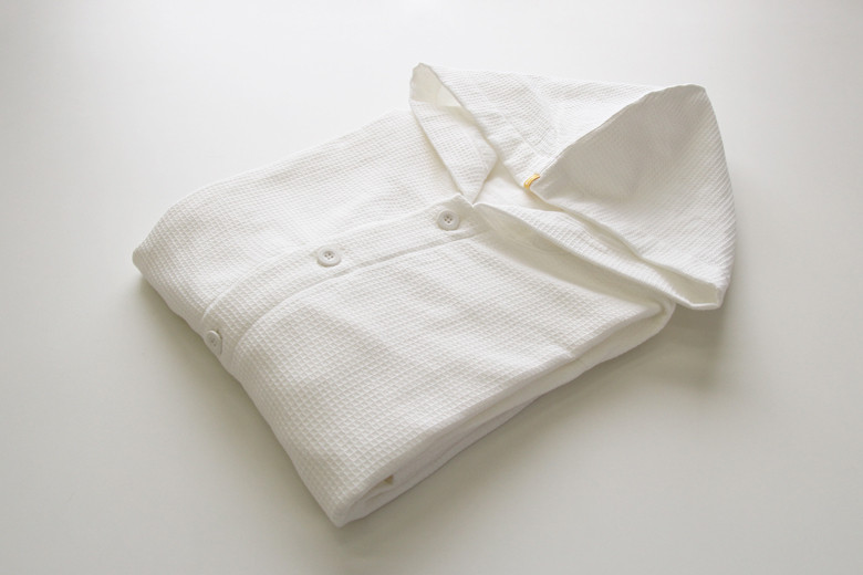 裏面はガーゼ生地、表面はワッフル生地の二枚重なった生地を使用したオーガニックコットン100%のサウナポンチョは吸水性抜群。保温性にも優れており、サウナでの外気浴時に身体を暖かく包んでくれます。ボタン付きの羽織れるオーガニックポンチョは、薄い生地なので畳むと嵩張らずにコンパクトに仕舞え、持ち運びしやすい大きさです。プールやサーフィン、海水浴時のお着替えポンチョとしてもお使いいただけます。