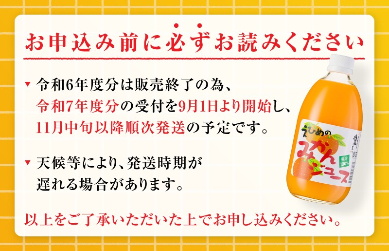 温州みかん果汁100%のジュースです! 【先行予約】(11月中旬以降順次発送)愛媛のみかんジュース(伯方果汁) 果汁100% 500ml×6本[V002080]