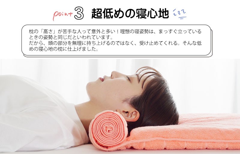 枕の「高さ」が苦手な人にぴったり。頭を無理に持ち上げるのではなく受け止めてくれるような超低めの寝心地にこだわった枕を使わない人のための枕です。