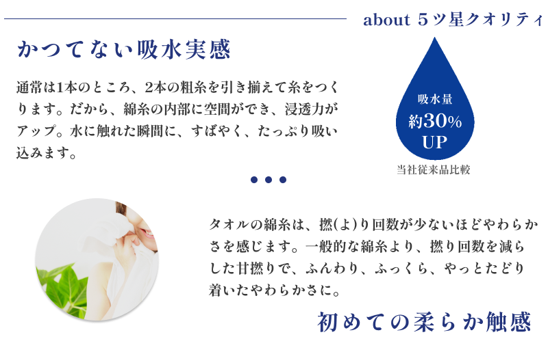 グッドデザイン賞受賞の5ツ星製法で仕上げたふんわりなめらかな肌触りと優れた吸水性が特徴です。