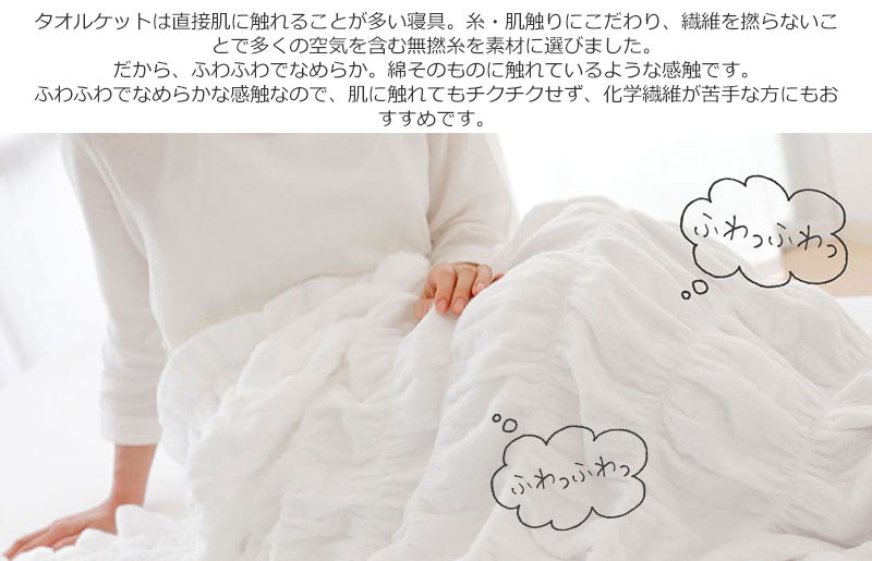 汗ばむ季節でもべたつかず快適にお使いいただく事ができ、肌寒い季節にはくしゅくしゅとしたタオルの層に温かい空気を保持します。