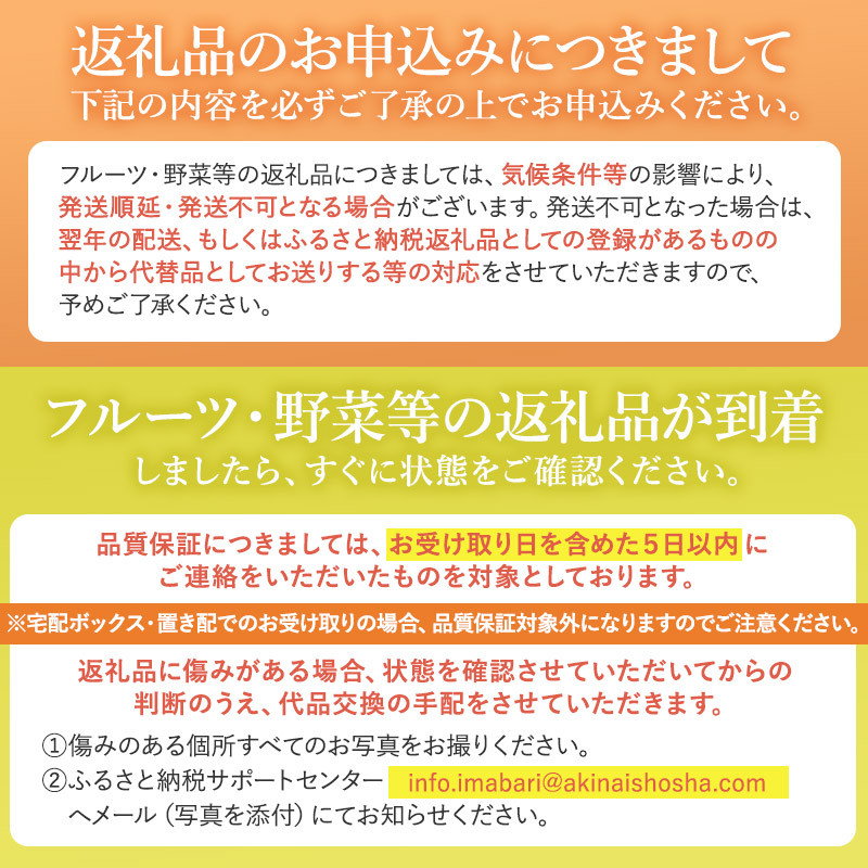 ※フルーツ・野菜等の返礼品が到着しましたら、すぐに状態をご確認ください。