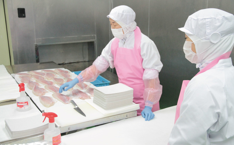 魚の毛細血管まで完全血抜きする特許製法「超冷薫」を用いて鯛を刺身用に加工しました