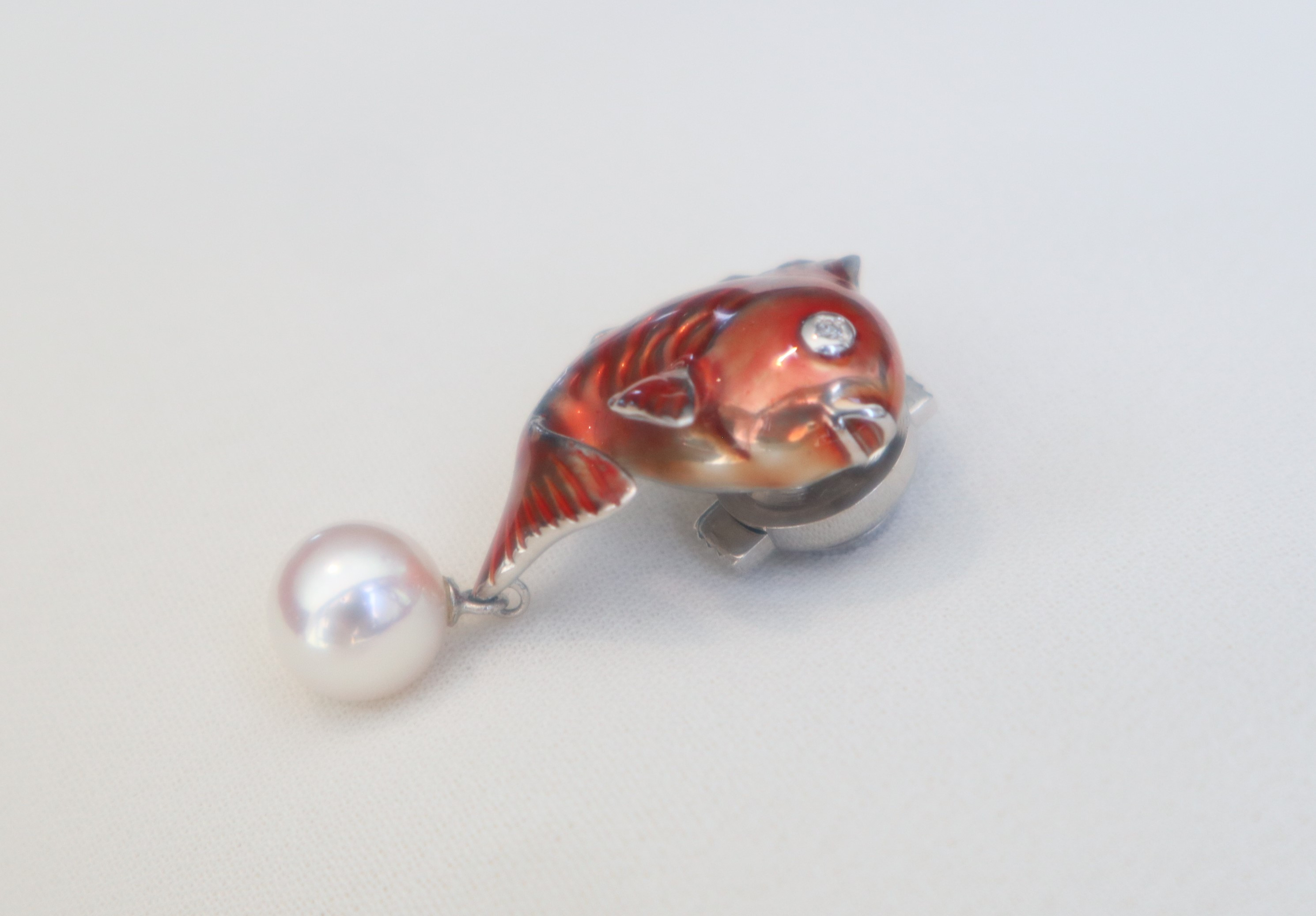 宇和島特産の鯛のモチーフにそっと揺れる真珠が輝く、とても縁起の良いピンブローチです。男女ともにお使いいただけます。