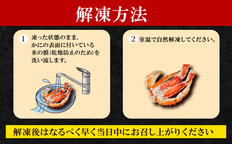 凍った状態のまま、かにの表面に付いている氷の膜を洗い流して室温で自然解凍してください。