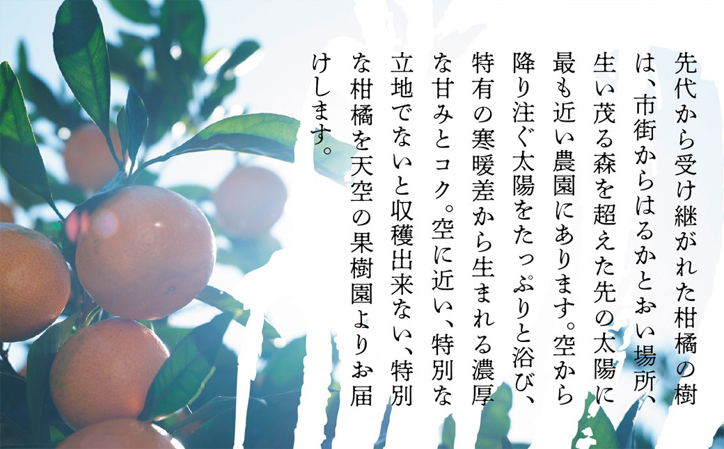 先代から受け継がれた柑橘の樹は、市街からはるかとおい場所、生い茂る森を超えた先の太陽に近い農園にあります。空から降り注ぐ太陽をたっぷりと浴び、特有の寒暖差から生まれる濃厚な甘みとコク。空に近い、特別な立地でないと収穫出来ない、特別な柑橘を天空の果樹園よりお届けします。