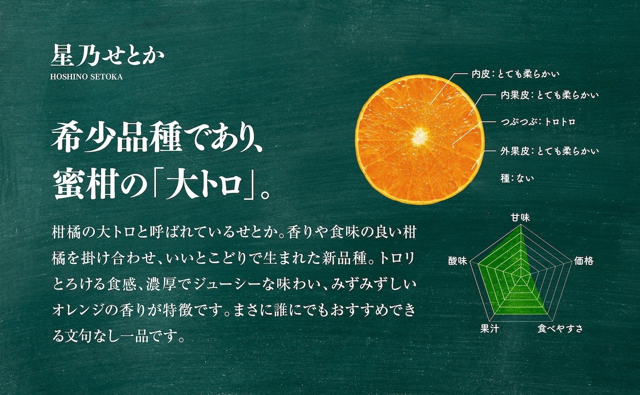 柑橘の大トロと呼ばれているせとか。香りや食味の良い柑橘を掛け合わせ、いいとこどりで生まれた新品種。トロリとろける食感、濃厚でジューシーな味わい、みずみずしいオレンジの香りが特徴です。まさに誰にでもおすすめできる文句なしの一品です。