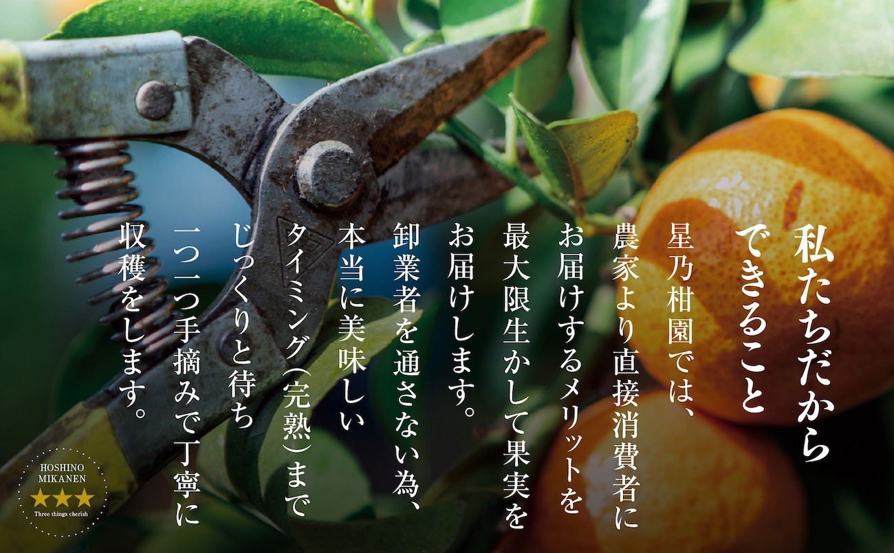 星乃柑園では、農家より直接消費者にお届けするメリットを生かして果実をお届けします。卸業者を通さない為、本当に美味しいタイミング(完熟)までじっくりと待ち一つ一つ手摘みで丁寧に収穫をします。