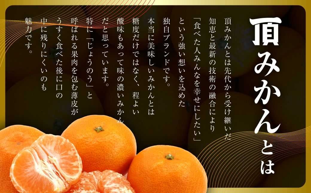 頂みかんとは先代から受け継いだ知恵と最新の技術の融合により、「食べた人みんなを幸せにしたい」という強い想いを込めた独自ブランドです。