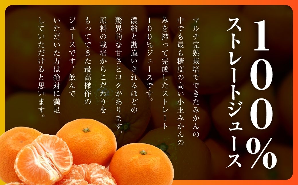 マルチ完熟栽培でできたみかんの中でも糖度の高い小玉みかんのみを搾って完成したストレート100%ジュースです。