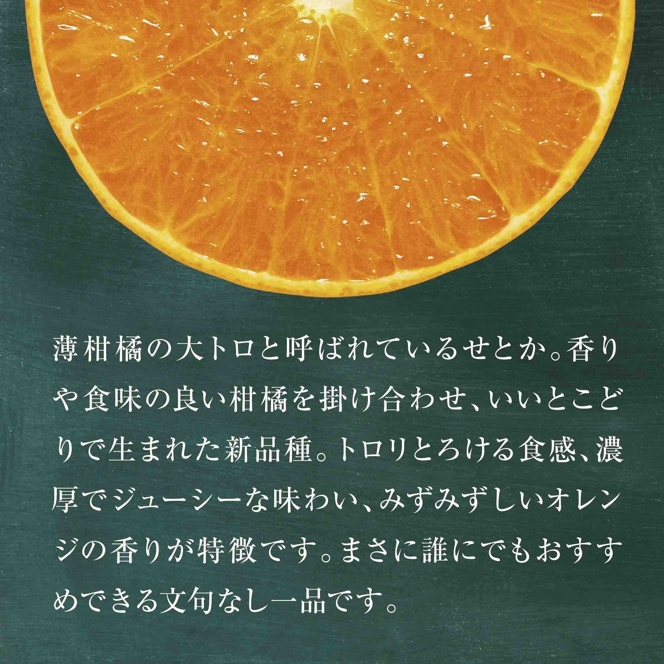 柑橘の大トロと呼ばれているせとか。 香りや食味の良い柑橘を掛け合わせ、いいとこどりで生まれた新品種。トロリとろける食感、濃厚でジューシーな味わい、みずみずしいオレンジの香りが特徴です。 まさに誰にでもおすすめできる文句なしの一品です。
