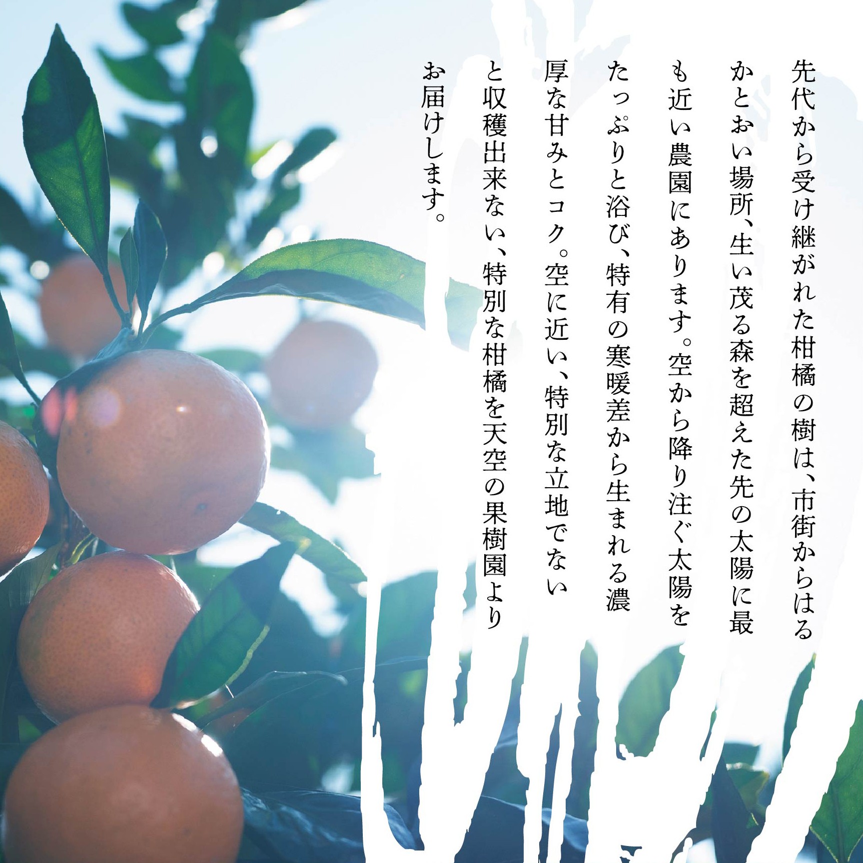 先代から受け継がれた柑橘の樹は、市街からはるかとおい場所、生い茂る森を超えた先の太陽に近い農園にあります。空から降り注ぐ太陽をたっぷりと浴び、特有の寒暖差から生まれる濃厚な甘みとコク。空に近い、特別な立地でないと収穫出来ない、特別な柑橘を天空の果樹園よりお届けします。