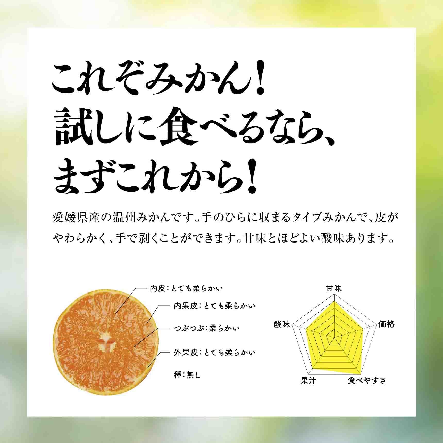 愛媛県産の温州みかんです。 手のひらに収まるタイプみかんで、皮がやわらかく、手で剥くことができます。 甘味とほどよい酸味あります。