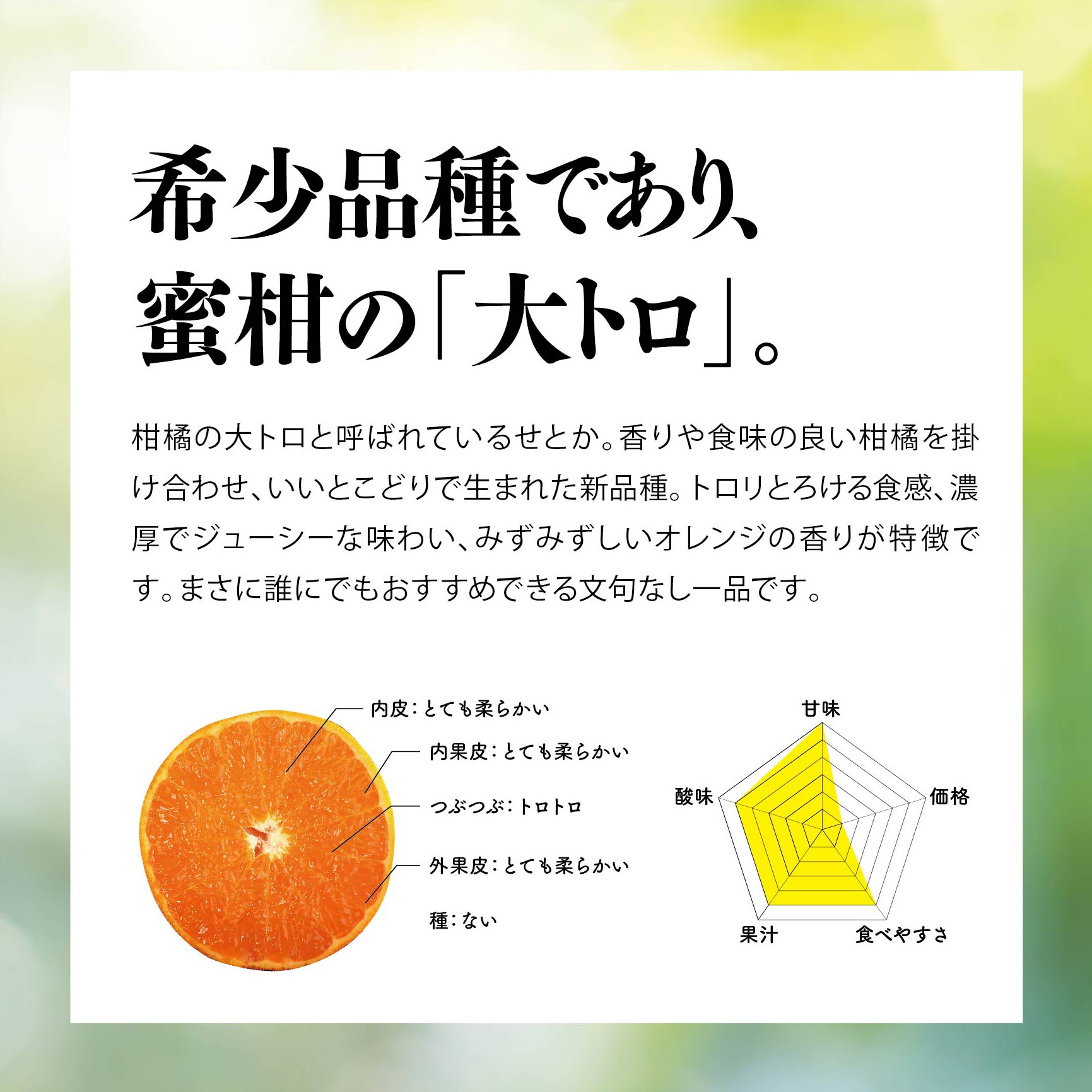 柑橘の大トロと呼ばれているせとか。香りや食味の良い柑橘を掛け合わせ、いいとこどりで生まれた新品種。トロリとろける食感、濃厚でジューシーな味わい、みずみずしいオレンジの香りが特徴です。まさに誰にでもおすすめできる文句なしの一品です。
