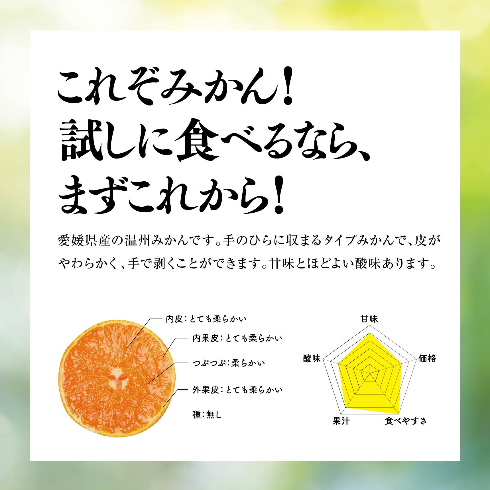 愛媛県産の温州みかんです。手のひらに収まるタイプみかんで、皮がやわらかく、手で剥くことができます。甘味とほどよい酸味あります。