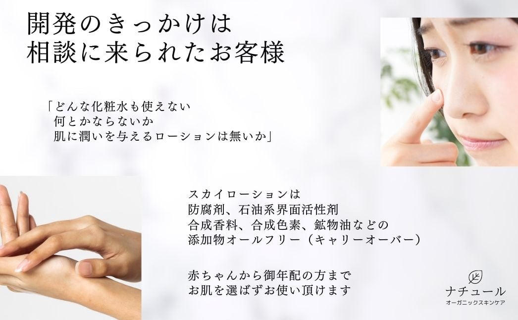 開発のきっかけは「どんな化粧水も使えない、何とかならないか。潤いある肌にするローションは無いか。」と相談に来られたお客様の声でした。スカイローションは、防腐剤、石油系界面活性剤、合成香料、合成色素、鉱物油などの添加物オールフリー(キャリーオーバー)赤ちゃんからご年配の方までお肌を選ばずお使い頂けます。