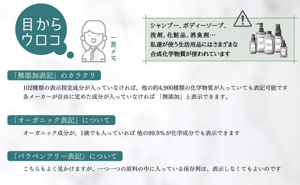 「無添加」表示は、102種類の表示指定成分が入っていなければ、他の約4,900種類の化学物質が入っていても可能です。各メーカーが自由に定めた成分が入っていなければ「無添加」と表示できます。「オーガニック」表示も、オーガニック成分が1滴でも入っていれば、他の99.9%が化学成分でも表示できます。「パラベンフリー」等の表示もよく見ますが、一つ一つの原料の中に入っている保存剤は、表示しなくてもよいのです。