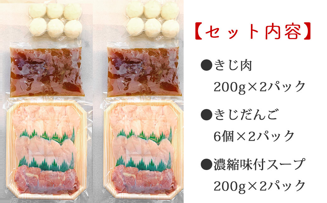 | 容量 | ・きじ肉(熟成)200g×2パック ・きじだんご6個×2パック ・濃縮味付スープ200g×2パック ※1パックにつき水800mlを加えてご使用ください。 |