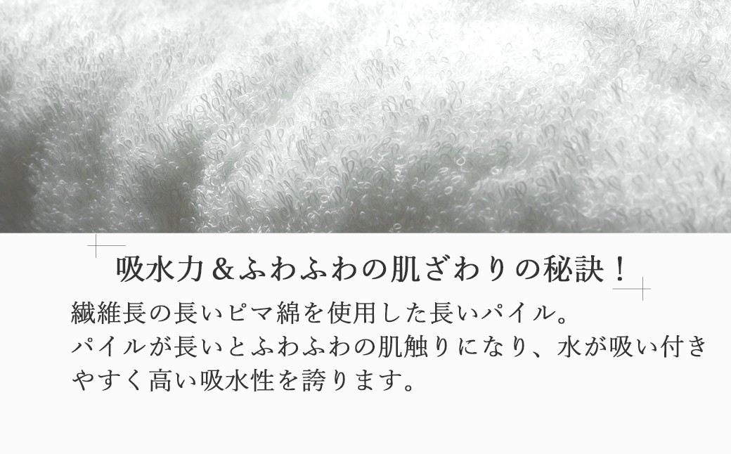 「MEZAMEシリーズ」は、アメリカのカリフォルニア州サンホーキンバレーで栽培された繊維長の長いピマ綿を使用しており、長いパイルがふわふわの肌触りと高い吸水性を誇ります。